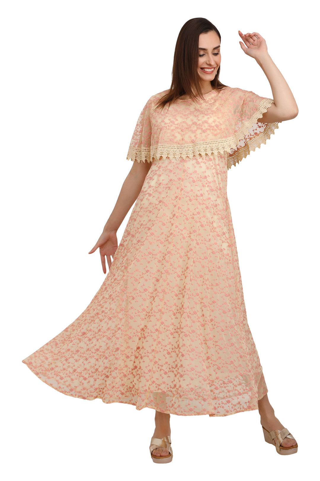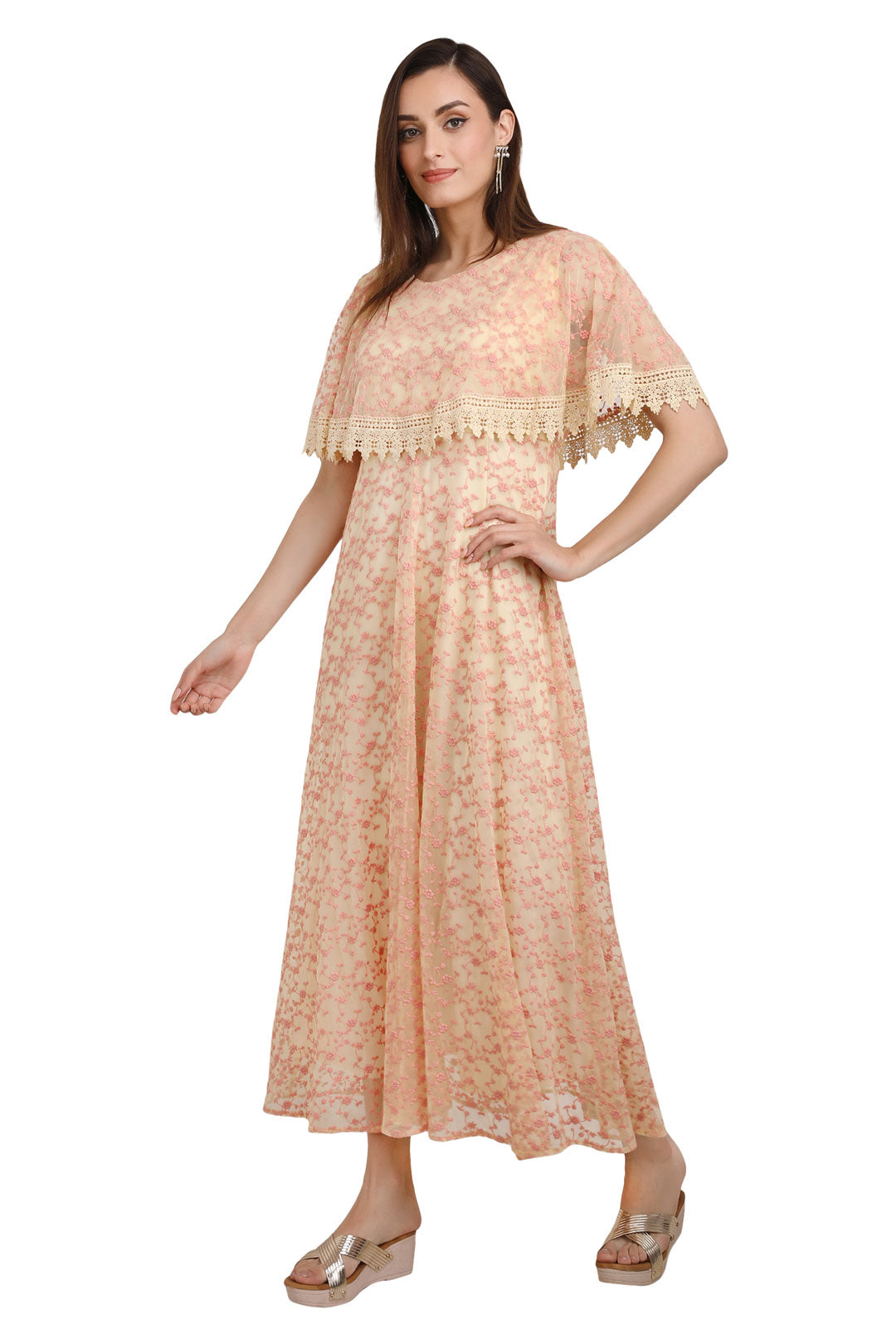 Luxury Mesh Embroidered Lace Long Dress – Peach